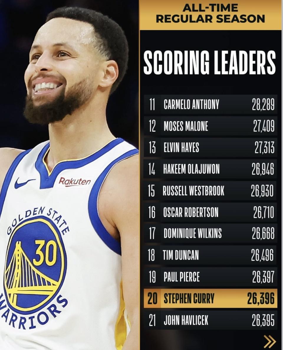这场打完,库里常规赛生涯总得分来到26,397分,追平皮尔斯,并列NBA历史常规赛得分榜第19位;哈夫利切克的26,395分被压到身后。