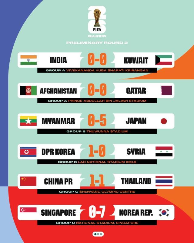在6日第五轮的18场比赛结束之后,六支球队又顺利地提前一轮拿到了第三阶段的参赛资格。韩国队在客场7比0击败新加坡队之后,顺利从第三小组杀入18强赛;第四小组的阿曼队客场3比0取胜中国台北队,锁定一个出线席位;第七小组的沙特队客场3比0拿下巴基斯坦队、约旦队主场3比0取胜塔吉克斯坦队,双双晋级下一阶段,而亚洲杯赛上的“黑马”塔吉克队,最终被证明只是昙花一现。